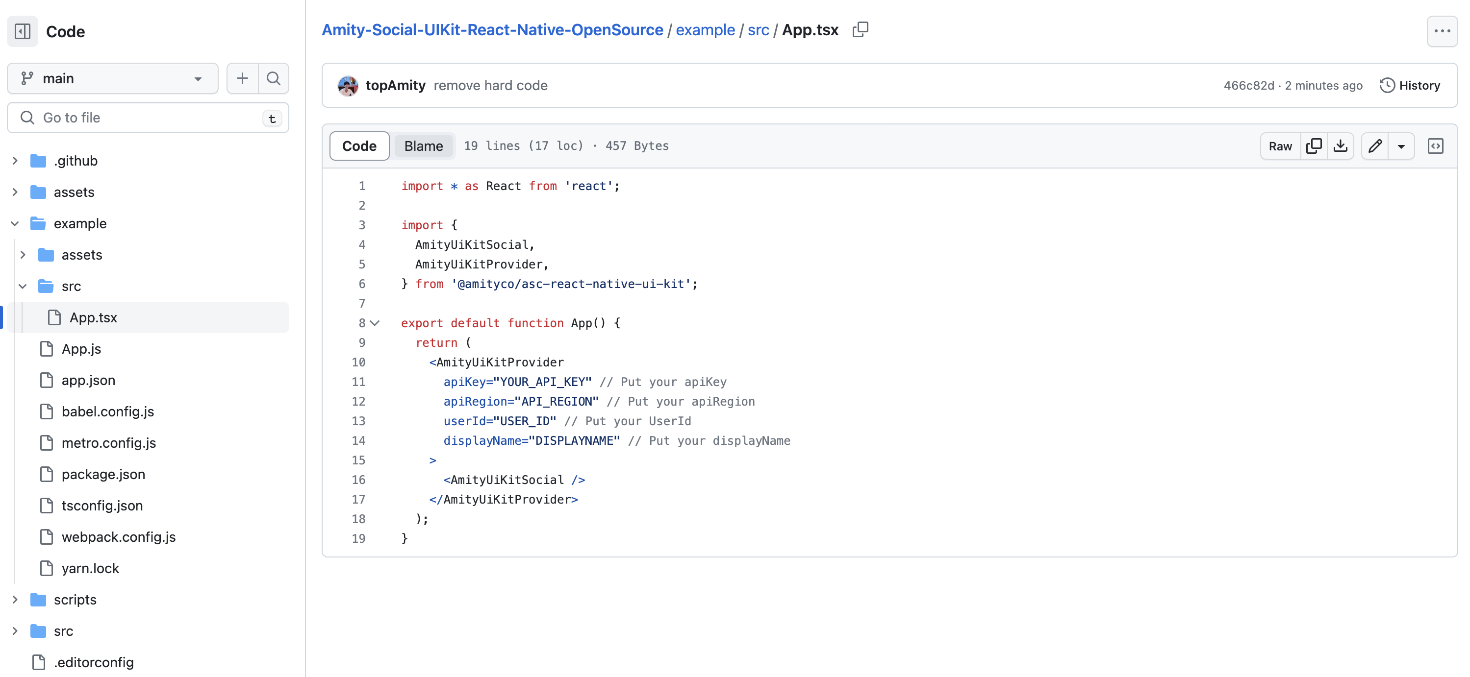2. **Configuration**: Configure your apiKey, apiRegion, userId, and displayName in the [/example/src/App.tsx](https://github.com/AmityCo/Amity-Social-UIKit-React-Native-OpenSource/blob/main/example/src/App.tsx) file before launching the sample app.